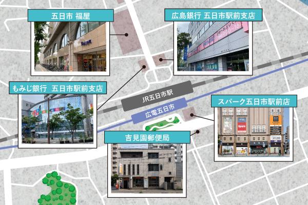 JR五日市駅前には施設が充実。駅下車→買い物→帰宅の動線がスムーズ(周辺マップ)