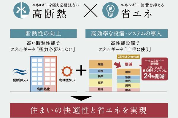 本物件は、強化外皮基準(断熱性能)を満たし、省エネによる一次エネルギー消費量を基準値から20%以上削減を実現、「ZEH-M Oriented」基準を満たしたマンション。