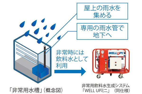 非常用水槽(地下に設置)と非常用飲料水生成システムWELL UPミニを併用することで、全住戸6日分の飲料水(一人1日あたり約3リットル)の供給を可能にしたほか、ポータブル発電機やマンホールトイレ、かまどスツールなどを共用スペースに装備しています。