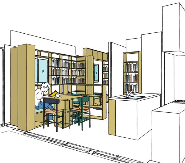 日中ほとんどの時間を過ごす想定でLDKと洋室3とに連続性を持たせ、たくさんの蔵書を収蔵。