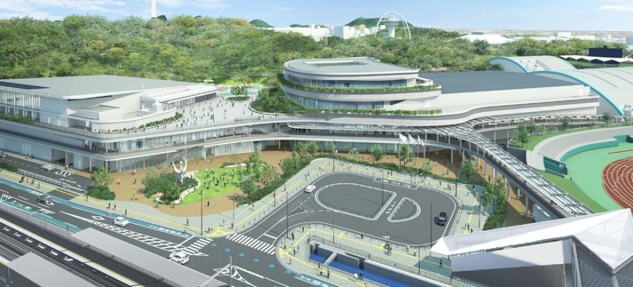 生まれ変わる公園の新たな玄関口として、2026年春に開業予定の新駅「手柄山平和公園」駅。「ひめじスーパーアリーナ」とは連絡デッキで直結し、雨でもストレスフリーな移動が可能。