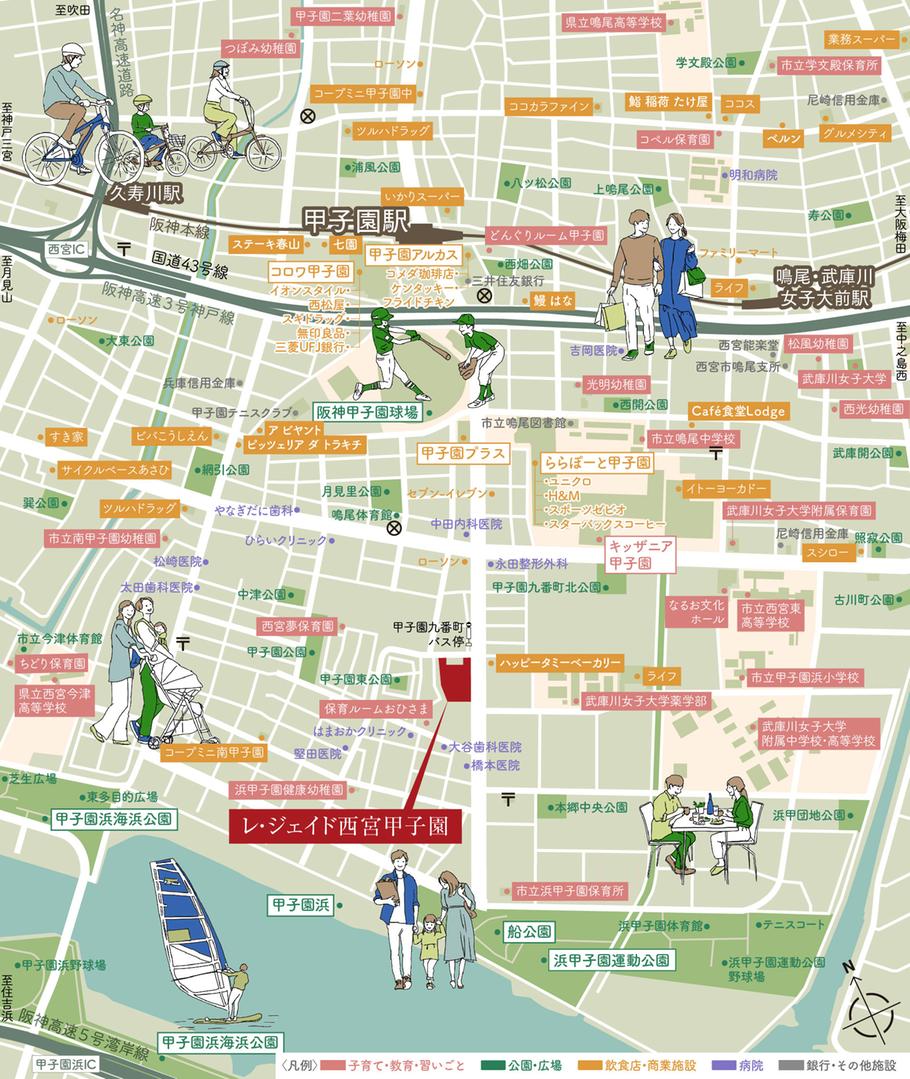 スーパーやドラッグストアはもちろん、駅からの帰り道や息抜きにふらっと立ち寄れる、カフェや飲食店が暮らしに華やぎをそえます。そして、阪神甲子園球場へは徒歩9分の近さ。仕事終わりのナイター観戦や休日の観戦も気軽にお出かけ。ますます新生活に期待が膨らみます。