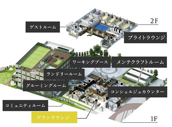 「共用計画の中心は、304世帯の“みんなのリビング”グランラウンジ。同じ1階には、ワーキングブース、メンテクラフトルーム、コミュニティ(キッズ)ルーム、ペットのグルーミングルーム、ランドリールームを用意。カスケード階段を上がり2階には、ブライトラウンジとゲストルーム〈spa/cinema〉があります」(上:敷地配置図を参照)