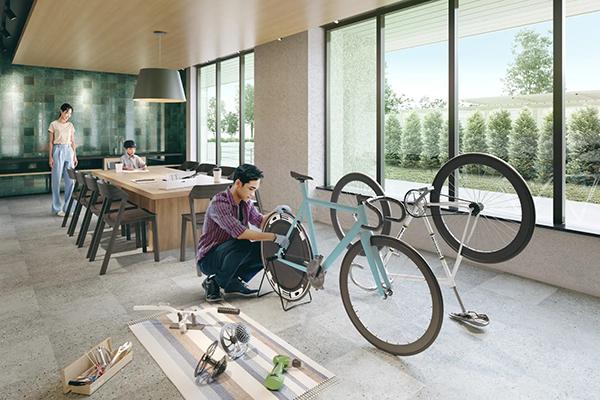「メンテクラフトルームは外部と連続する土間と大型シンク、ロッカーを備え、キャンプギアや自転車のメンテナンス、子どもの絵の具遊びまで“気兼ねなく”使えます。汚れや水濡れに強い床は、片付けも容易です。趣味の世界を住戸以外で楽しめる空間は家事負担や家庭内のストレスも減らすことに繋がると思っています」
