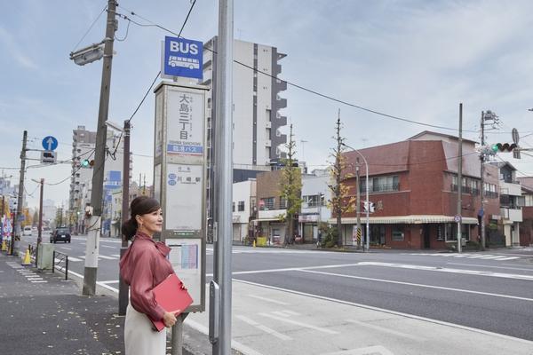 最寄りの大島三丁目バス停からは、朝の通勤時間“約4分に1本”の割合で路線バスが運行