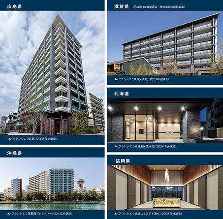 事業エリア・分譲事例(上〈ブランシエラ札幌桑園〉、右〈ブランシエラ大宮 氷川の杜〉左〈ブランシエラ神宮の杜〉下〈ブランシエラ那覇赤嶺ステーションファースト〉 (全て分譲済み)