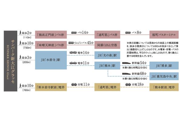 JR豊肥本線「水前寺」駅徒歩3分。同駅から「熊本」駅まで11分と軽快。また、徒歩2分の「熊高正門前」バス停から「通町筋」バス停までは14分、徒歩10分の「新水前寺駅前」電停から「通町筋」電停までは市電で11分と、主要エリアへのアクセスはスムーズです。