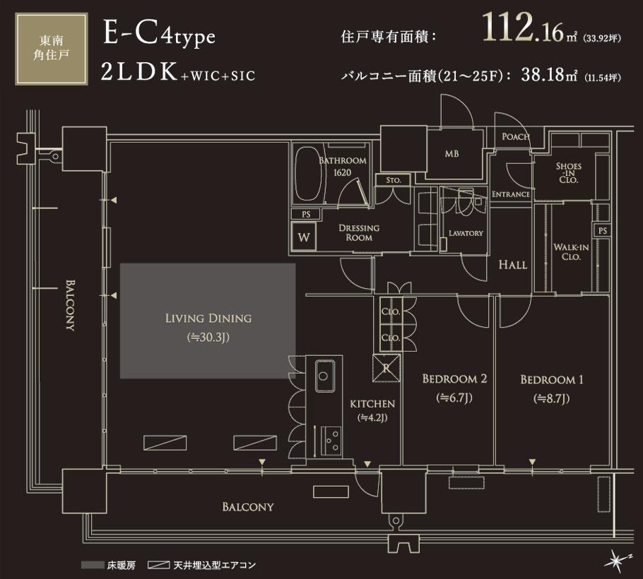 【E-C4タイプ・2LDK+WIC+SIC】専有面積/112.16m2 バルコニー面積/38.18m2(21~25F)