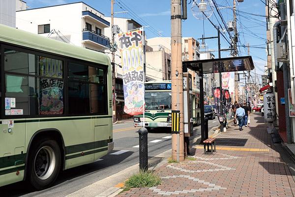 徒歩2分にバス停があり、次々とバスがやってくる便利なポジション(千本出水バス停)