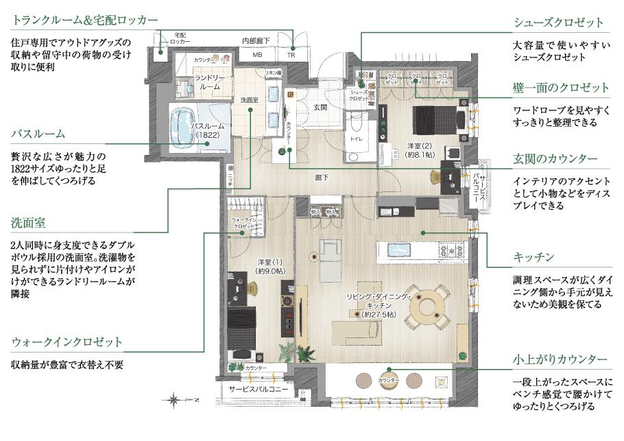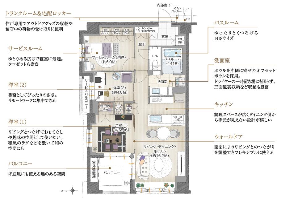 ※3:バルコニー面積:6.01m2 サービスバルコニー面積:1.97m2 室外機置場面積:1.56m2 専有面積にトランクルーム面積:0.31m2・宅配ロッカー面積:0.31m2を含む
