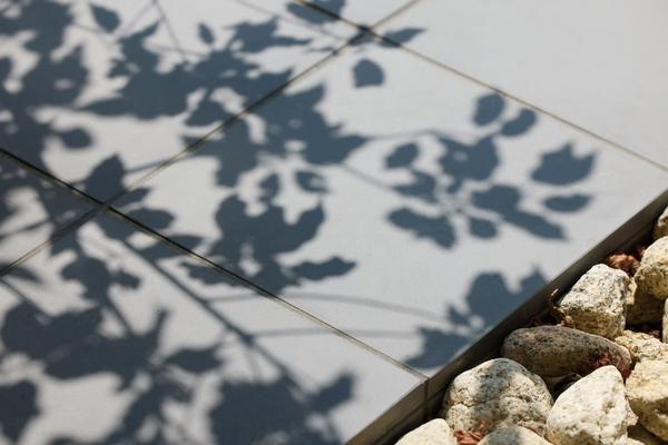 植栽の影が表情豊かに映る淡路産瓦タイルを採用(エントランス※2)