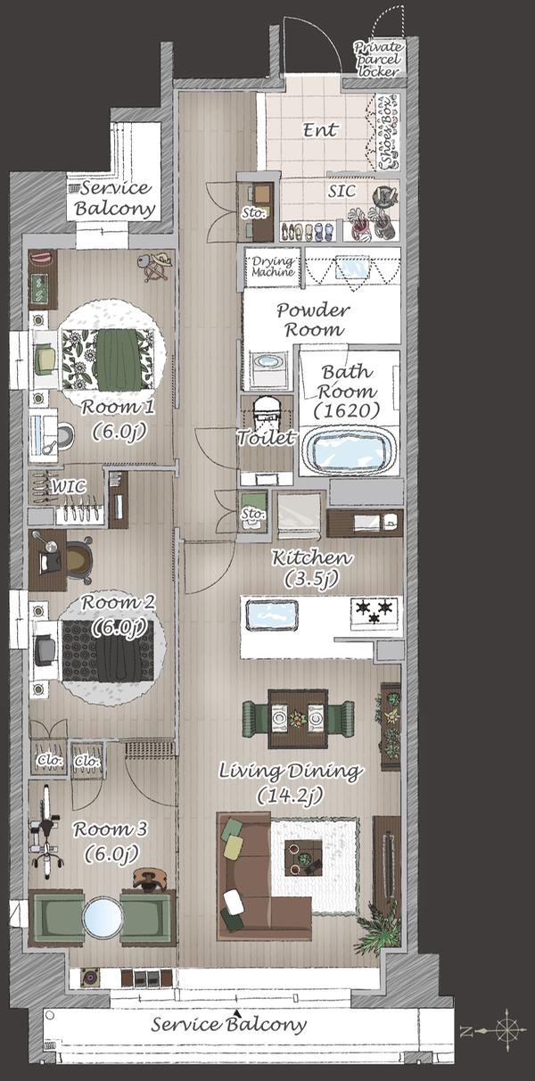 ※1:サービスバルコニー面積/8.16m2 アルコーブ面積/0.96m2 専用宅配ロッカー面積/0.44m2(家具配置イラスト/WIC=ウォークインクロゼット)