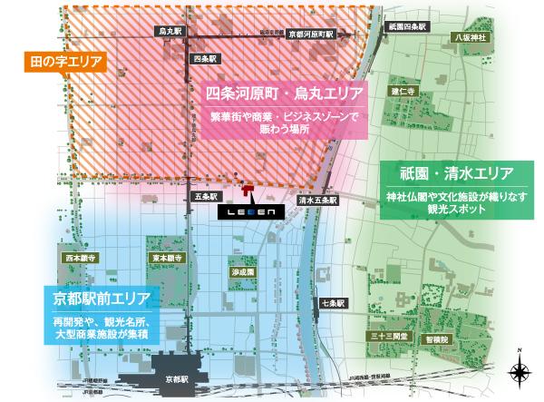 歴史ある田の字エリアに隣接する、「五条」駅徒歩4分の駅近立地であり、京都の玄関口・JR「京都」駅から1.5㎞圏という近さ。