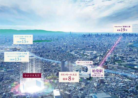 Osaka Metro谷町線の始発駅であり、大阪モノレールと結節する『大日』駅から徒歩11分。谷町線を使えば『東梅田』へ19分。始発駅の特権で、座って通勤がしやすくなるほか、大阪モノレールを使えば『大阪空港』へ37分で直結するため出張移動もスムーズに行えます。2033年度には、東大阪市(瓜生堂)までモノレールが延伸予定でJR線・近鉄線への接続も容易に。“沿線力の向上”は地域の魅力を高める要因となります。