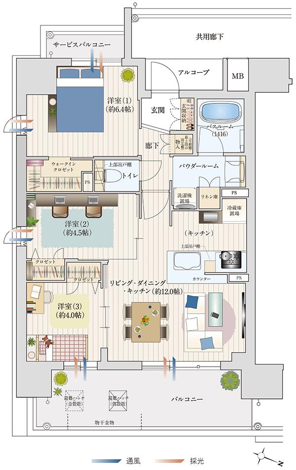 全ての居室が共用廊下に面していない点も、角住戸のメリットの1つ。主寝室として使いたい洋室(1)は約6.4畳のゆとり。サービスバルコニーがあることで、プライバシー性を高めています。また、洋室(1)には大容量のウォークインクロゼットが用意され、洋室(2)・(3)のクロゼット、廊下の物入、玄関収納、パウダールームのリネン庫など、収納スペースは充実しています。
