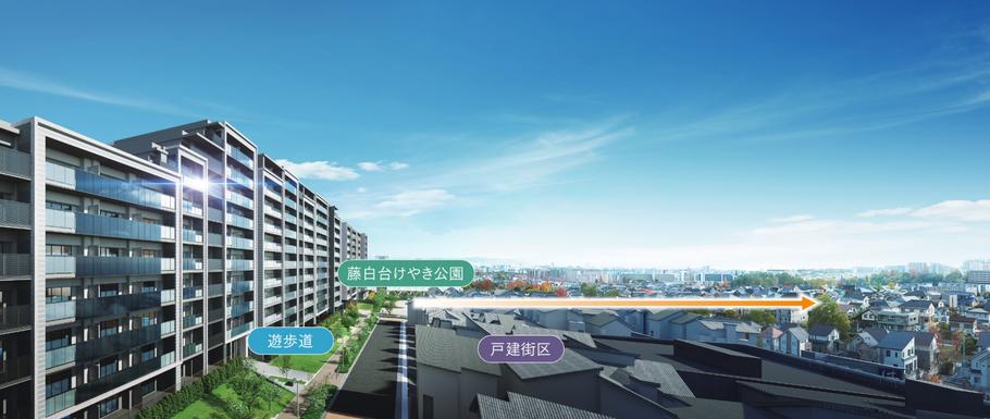 住まいの窓側に広がるのは穏やかな戸建て街区の風景。将来的に高い建物が建てられる可能性も低く、開放感があふれる暮らしを長く愉しむことができます。