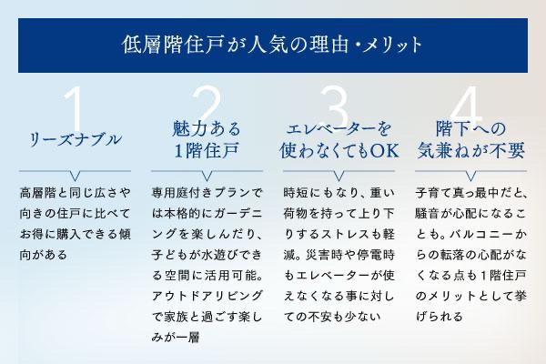 ガーデニングをしたり、ガーデンパーティーを楽しめるのもテラス・専用庭付プランの魅力。空の下のアウトドアリビングとして活用が可能。外出の際にもエレベーターを使う事無く時短できます。郵便物の確認やゴミ出しなど、生活動線がスムーズで快適です。万一の災害時にもすぐに外部へ避難することができます。非常時にエレベーターが使えない時にも、階段を使わずに出入りでき安心できる要素のひとつとなっています。