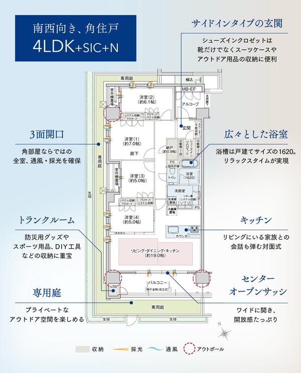 南西角住戸、3面開口でより戸建て感覚で暮らせるW-Agタイプ。約19.0帖のワイドなリビング・ダイニングが特徴的なプランで、玄関はサイドインタイプでプライバシーに配慮した設計となっています。シューズインクロゼットや納戸、システム収納など、豊富な収納スペースを確保。家族と会話が弾む対面式キッチンも魅力のポイントです。