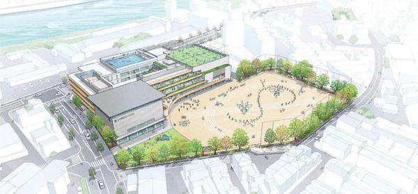 豊中市立庄内よつば学園の完成予想図は豊中市から提供を受けたもので、実際とは異なる可能性があります。