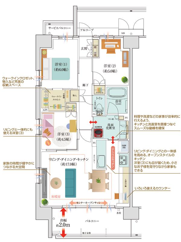 全居室に窓を設け、通風・採光に優れた角住戸で、洗面室への動線を設けたオープンスタイルの広々アトリエキッチンを採用