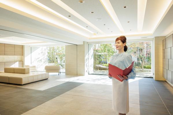 オートロックを解除して建物内へ入ると、美しい中庭を一望するガラス張りのラウンジがお出迎え。柱部分は旧帝国ホテルの玄関にも使われた宇都宮特産の「大谷石」で仕上げられており、天然石特有の重厚な質感が住まいの風格を演出します。