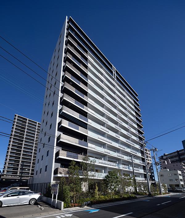 地上15階建て、モノトーンを基調としたスタイリッシュな外観フォルムは目を惹く存在