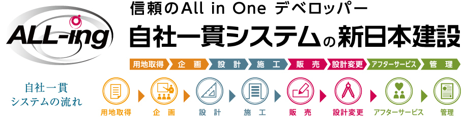 【用地取得】「強みは各部署とすぐ綿密な打ち合わせが出来、結論が出せます。そのスピード感のおかげで競合の多いエリアでも用地取得できるケースが多くあります。」【建築企画】「一つのプロジェクトにずっと関わっていく部署です。用地取得時から始まり、設計部、工事部や販売部とも連携しています。」【設計】「用地取得時に建築企画・設計でフォローをしていきます。その後設備仕様や建物のデザイン、間取りの検討。その流れを経て工事部へ図面を引き継ぎます。」【施工】「工事部としては、経験に裏打ちされた作業があると思っています。決断が早くスムーズに進むというところは実感としてあります。」【販売】「お客様からのご質問に対して建築企画・設計・工事部と連携し、スピーディーな回答が出来る点やお引渡後も連絡を取れる点は、入居後の安心につながる点かと思います。」【アフターサービス】「部署の中で意見交換をしたり、知識の共有をしています。設計部や工事部も同じ社内なので連携は取りやすいですし、ここはメリットだと感じています。」【管理】「不具合等をその場でご指摘いただいてもすぐ対応できることが自社一貫システムの強みだと思っています。」