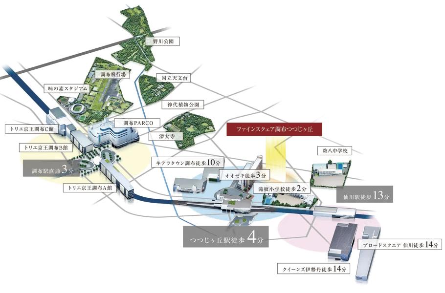市内では「調布花火」や「映画のまち調布シネマフェスティバル」、「味の素スタジアム」などスポーツやイベントが充実。調布駅・仙川駅の利便性に加えて、調布市の豊かな自然環境と文化体験を楽しめる点が〈ファインスクェア調布つつじヶ丘〉の立地面の強みとなる。
