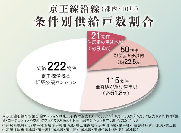 建設地は「つつじヶ丘」駅徒歩4分という駅アクセスが良好な場所でありながら、四方向道路に面した場所。街道から一本奥まった好立地で、駅近ながら低層の住宅街が広がっている点は、つつじヶ丘ならではの魅力だ。過去10年間、京王線沿線で分譲された東京都内のマンションの内、駅徒歩5分圏かつ急行停車駅で、住居系用途地域を含む敷地のマンションは、1割にも満たない。データが示す通り、本物件は、そうそう出会えないスペックを有している。