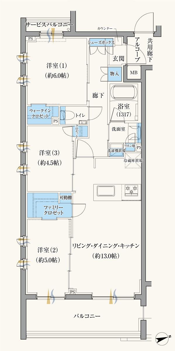 専有面積:65.32m2 バルコニー面積:9.99m2 サービスバルコニー面積:1.49m2
