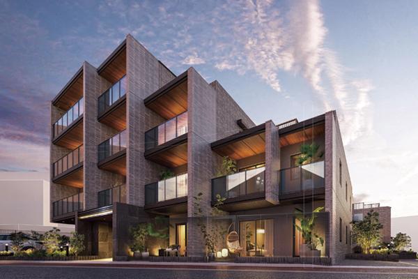全住戸の間口を道路側に配置し、通風・採光に優れた住戸プランを提案。外観デザインは、壁面のクラシカル調タイルとガラスパネルのバルコニーとの組み合わせにより、瀟洒で洗練された印象に仕上がっている。軒を木目調とすることで高級感を演出し、雁行したリズミカルなフォルムは、視認性が高く存在感が際立つ。自然石を施したエントランスも格調高いつくりだ。