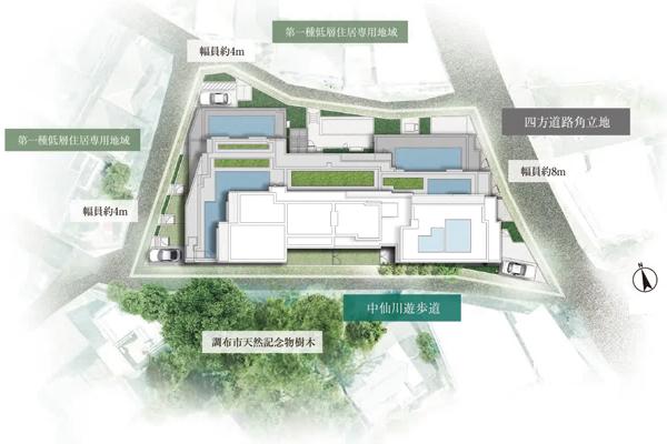 調布市内は、80%以上が住居系用途地域に指定されており、約56%が「第一種低層住居専用地域」の良好な住環境が広がる。第一種低層住居専用地域を含んだ敷地に誕生する本物件は、調布市の魅力を集約したような魅力的なプロジェクトと言えるだろう。