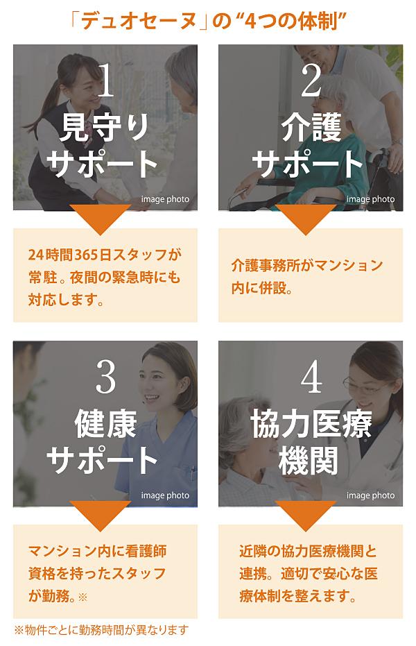 デュオセーヌでは、自分らしい自由な暮らしの実現の為に、(1)見守りサポート、(2)介護サポート、(3)健康サポート、(4)協力医療機関の「4つの体制」で居住者の安心・安全で快適な暮らしをサポートします。