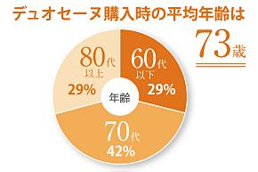 デュオセーヌの購入時の平均年齢は73歳。70代が42%、60代と80代が29%を占めます※デュオセーヌ調べ(2021年12月時点)
