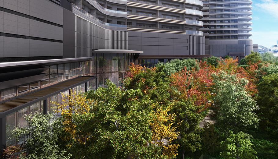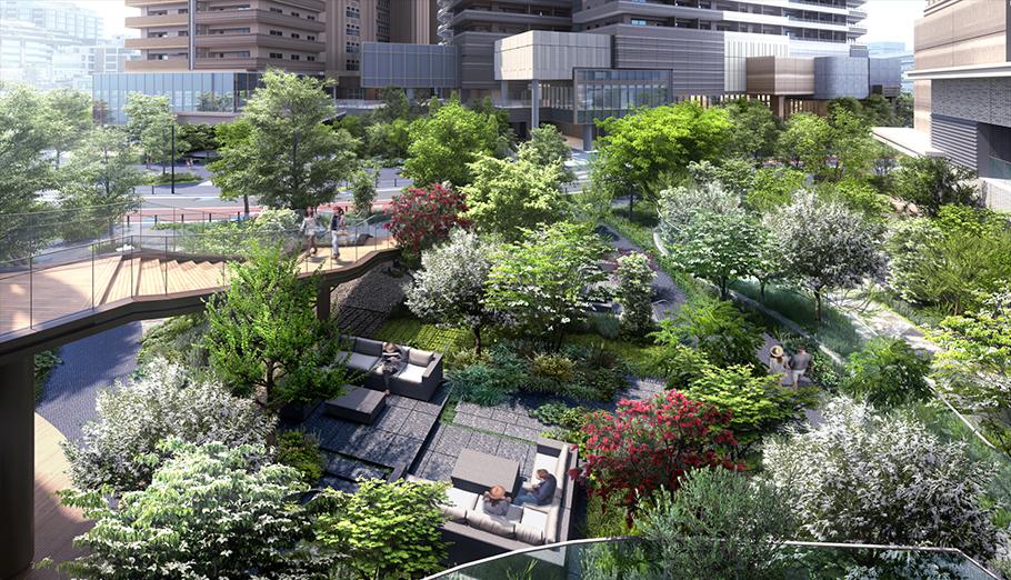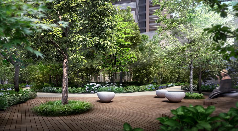 ※掲載の完成予想CGは、計画段階の図面を基に描き起こしたもので、形状・色等は実際とは異なります。なお、形状の細部、設備機器等は表現しておりません。表現されている植栽は初期の生育期間を経た状態のものを想定して描いており、竣工時は植物の生育を見込んで必要な間隔をとって植えております。施工上の都合により、設定位置・植高・本数等変更となる場合があります。周辺の建物などについては一部簡略化しており、実際とは異なります。