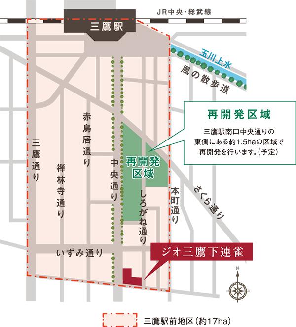 三鷹市は、現在、「ジオ三鷹下連雀」にほど近い中央通り沿いを舞台に、「三鷹駅南口中央通り東地区再開発事業」を策定。三鷹らしい自然にあふれた、子どもが笑顔になれる「こどもの森」をコンセプトに、緑に包まれた広場や商業施設、公益施設等からなる複合都市施設が構想されています。