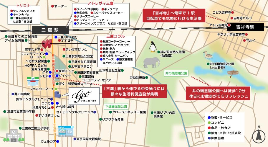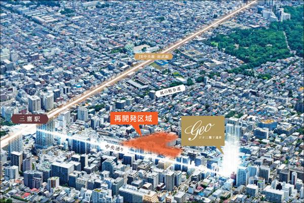 「ジオ三鷹下連雀」が誕生するのはJR「三鷹」駅へ徒歩7分、真っ直ぐ伸びる中央通りを進んだ角地。アトレヴィ三鷹や三鷹コラルなど駅周辺の商業施設を気軽に利用できるだけでなく、三鷹中央通り商店街の多彩なお店を利用しながらの帰宅もできる快適なポジション。