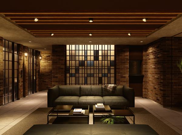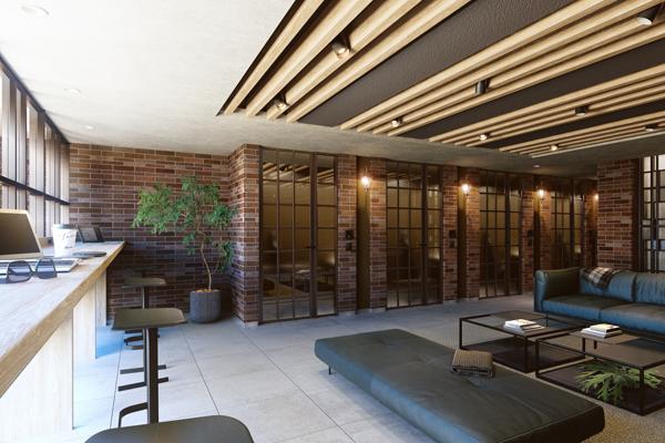 かつての飛行場や工場の存在からくる「インダストリアル」なイメージを活かしたという。深みのある色合いのレンガ調タイルやコンクリート打ちっ放し風の意匠を取り入れ、モダンかつ重厚感のある空間を創り出している。外観、共用部とも住まいに個性を求めるオーナーの所有欲に応えるデザインと言ってよいだろう。