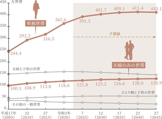 東京都の統計によると、「子どもがいる世帯」はゆるやかに減っていく一方、「単独世帯」や「夫婦のみの世帯」は増加傾向に。世帯構造に合った2LDKは引き続きニーズがありそうです。
