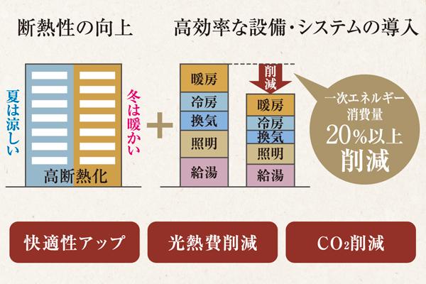 ZEH-M(ゼッチマンション)とは、一次消費エネルギー「ゼロ」を目指した省エネマンションのことです。高断熱&高効率な機器の導入で環境に、健康に、家計にやさしい住まいに。本物件は、冷暖房費や光熱費といった一次エネルギー消費量の20%以上削減を実現しています。