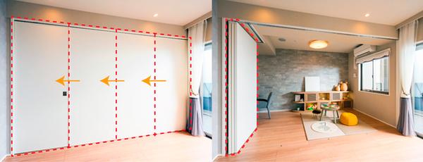 LDKと洋室2を分けるのは可動間仕切り「ウォールドア」。左右にスライドするのみの「引き戸」とは異なり、コンパクトにまとめることができます。そのため、リビングとの一体感を高く感じられるのが特徴。ご家族の人数によって、お子さまが小さいうちなどは2LDK使いで、広々したリビングを満喫できます。個室が必要になった際には閉めて使用。また可動が容易なので来客時にサッとしめて散らかったリビングの一部を隠すなどフレキシブルな使い勝手の良い間取りです。