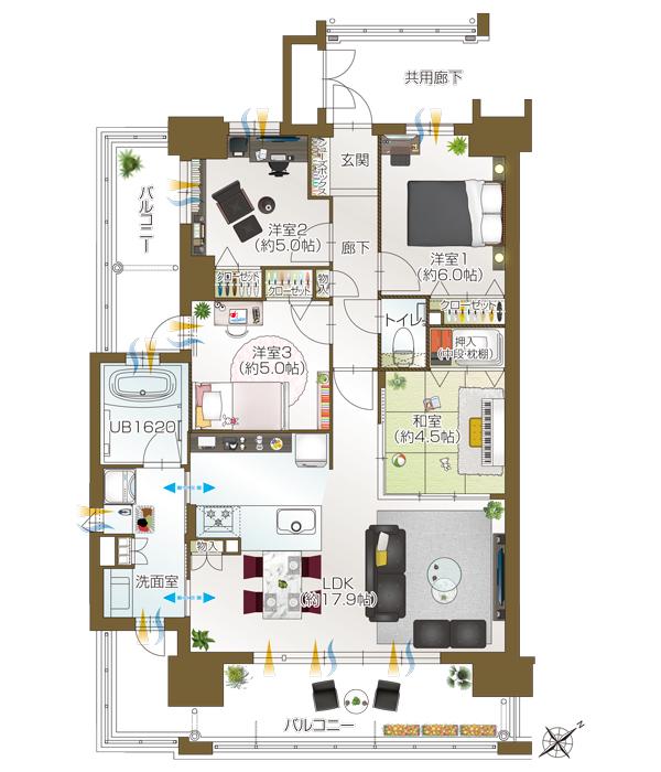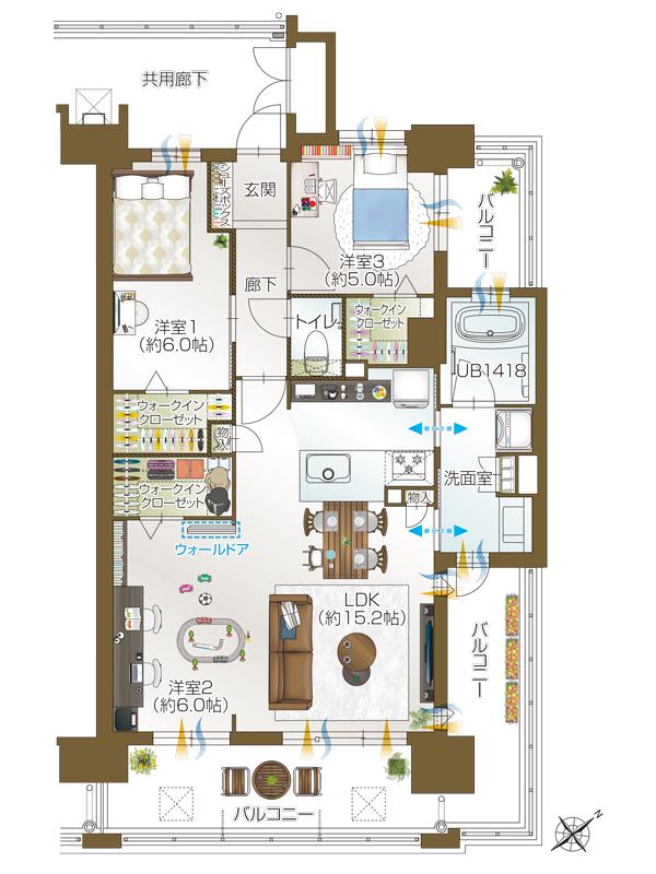 Dtype・3LDK+3ウォークインクローゼット 専有面積/75.98m2 バルコニー面積/23.34m2