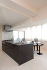 ダークな色調にこだわったアイランドキッチンは濃い色の建具や床とマッチし、スタイリッシュな雰囲気を演出しています。また空間の凹凸をなくし、スッキリ見せる「レスデザイン」という考え方のもと、梁の凹凸を解消。梁にはダウンライトを埋め込み、お洒落なデザインのキッチン空間を実現しています。