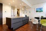 既存の和室とリビング・ダイニングを一体化し、広いLDKを実現。元の和室部分にオープンなアイランドキッチンを新設し、背面にはパントリーも設けました。回遊できるキッチンは、二人で料理を楽しむには最適。玄関付近にある2つの洋室はそれぞれゲストルームと、書庫、ウォークインクロゼットへの変更を行いました。