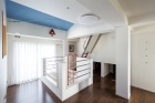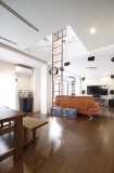 リビングからハシゴを使って上り下りできる子ども部屋。隣には多趣味なご主人様が利用する趣味室(ファミリースペース)。秘密基地のような雰囲気を保ちながら、家族の気配を感じられるようオープンスペースにしています。また子ども部屋と集中収納という、空間を上下に仕切る提案を気に入って頂き、遊び心あふれる住まいになりました。