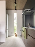 キッチン奥には猫目線からも外の景色を眺めることができる、高さのあるスリット窓を設置。明るく開放感あふれる空間を演出している