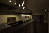 モダンでシックなキッチン。タイルを張り巡らせた個性的なカウンターも、オリジナルで造作している。陰影をより美しく見えるように、タイルの色や素材も厳選。キッチン後ろの収納棚は、オーディオの棚と同様のデザインにして、リビングとの連動感を出している。「キッチンは対面式にしたので、お客様とおしゃべりしながら料理ができて楽しいです」