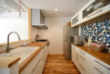 木の天板が、ナチュラルで優しい印象のキッチン。白いタイルとエスニックな雰囲気のモザイクタイルを組み合わせて、彩りある空間に仕上げている。また、背面にはカウンター収納を設け、作業も片付けもはかどるように。さらに、もともとLD側にあった吊り戸棚をなくしてオープンにし、LDにいるお子さんを見守りながら調理ができるなど、家事効率の高いキッチンとなった