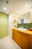 時間をかけて選んだモザイクタイルを張り合わせ、明るい雰囲気に仕上げた造作洗面台。白い陶器の水栓は輸入品で、Sさん夫婦が見つけて購入したもの。お気に入りの設備や部品をつかえるのも、造作の特長だ。また、タイルと同じく、Sさん夫婦の好きな色であるグリーンを、洗濯機を隠すロールスクリーンにも採用している