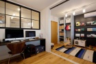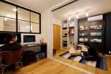 LDKとつながるワークスペースと、ゲストルーム兼子ども室。空間を広々と見せる内窓は、黒いアイアンで、インダストリアルな雰囲気にデザイン。天井ぎりぎりまでスペースを大きく使っていると同時に、作業に集中できるよう、玄関にいる人と目が合わない絶妙な高さに設計しているのはさすが。また、ゲストルームは引き戸にして、来客時にはおもちゃなどがすぐ隠せるように配慮した